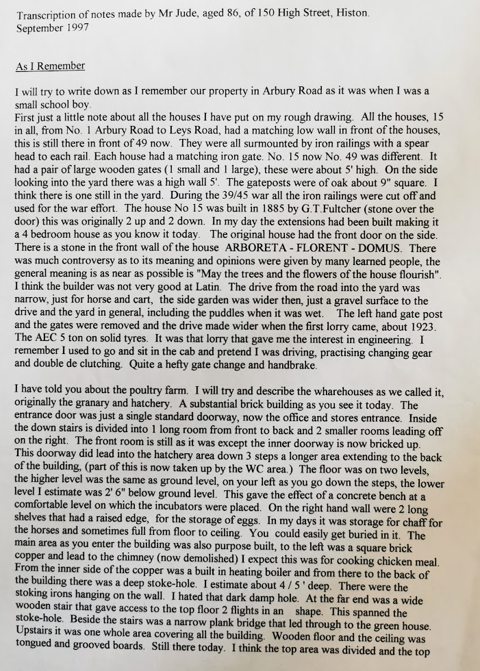 The Museum received a detailed description of 49 Arbury Road from Mr Jude of Histon in 1997.