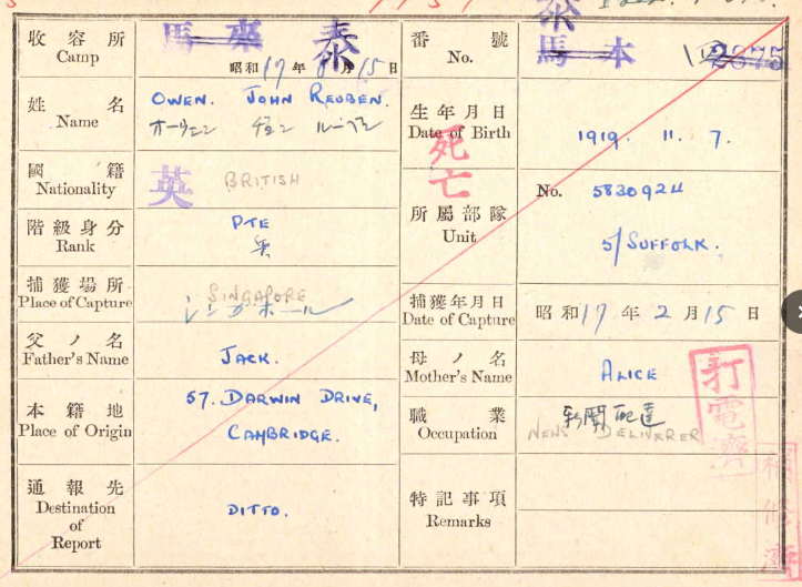 John Reuben Owen: Private, 5830924, 5th Battalion, Suffolk Regiment, who died on Saturday 10 July 1943. Age 24. Commemorated on SINGAPORE MEMORIAL Singapore. Son of John Owen, and of Alice Margaret Owen, of Cambridge.