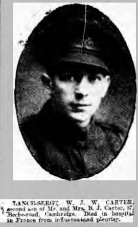 Lance Sergeant W J W Carter, second son of Mr and Mrs B J Carter. Died in hospital in France 3.11.1918 from influenza and pleurisy.