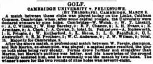 The prize meeting took place on Monday 15 November 1880 on the University Green, Coldham Common. Rain fell heavily all afternoon making play difficult.