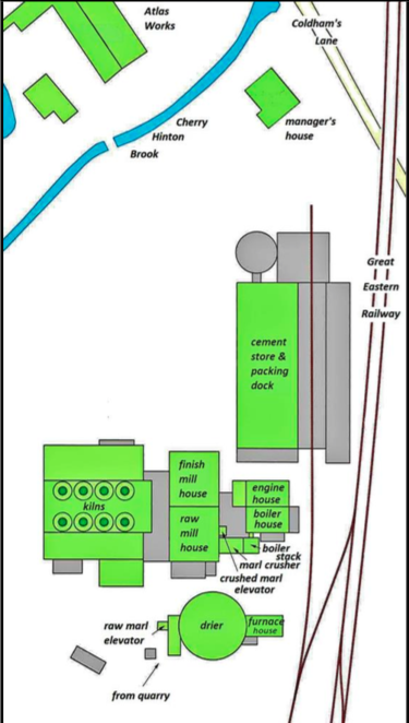 The site is bounded by Cherry Hinton Brook to the west, Coldham’s Lane to the north, the Cambridge to Newmarket‒Bury St Edmunds railway line to the east and The Tins pathway to the south. It is now an Army Reserve Centre, except for the north-west edge which is part of the car park for the neighbouring Sainsbury’s (built on the site of the old Atlas Works).