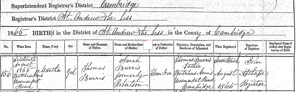 Martha Burris b1865 Butcher’s Arms, Newmarket Road