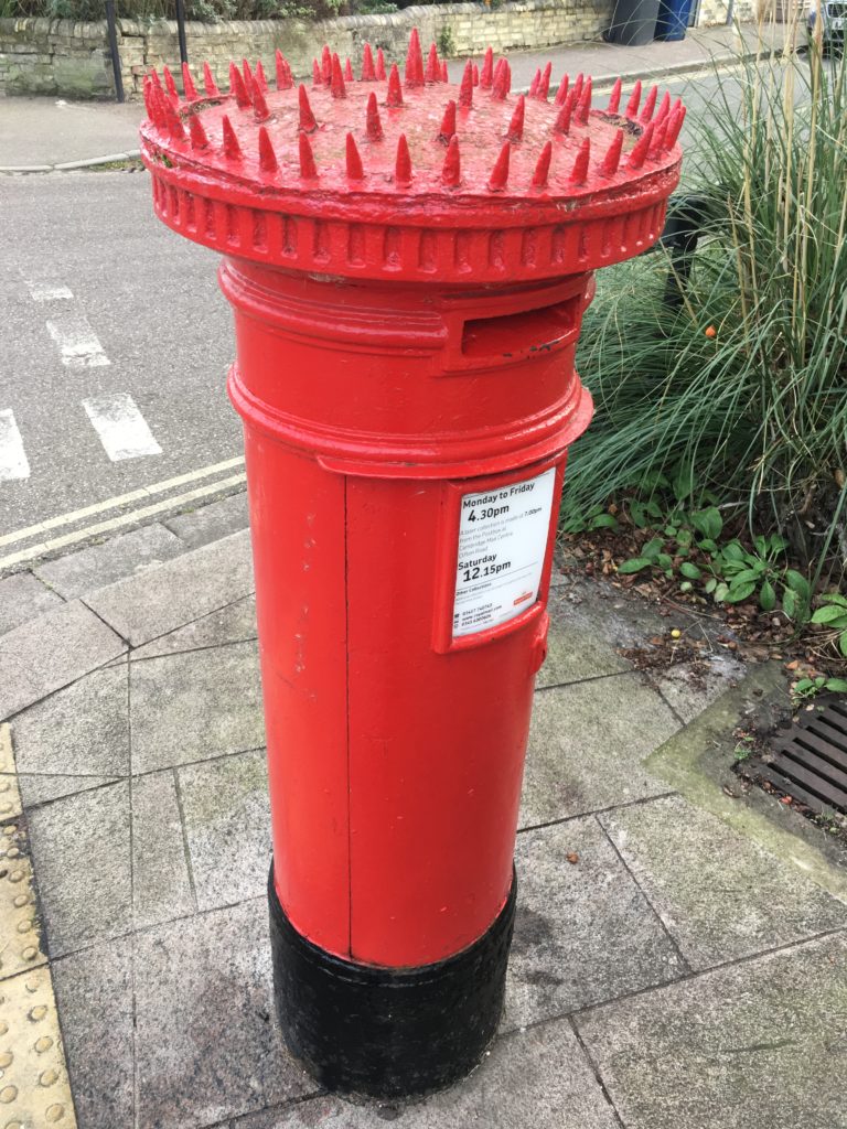 It is thought that this pillar box was moved from its original location near the gasworks – now Newmarket Road Tesco – with the spiky top remaining, which was originally added to stop people using it to climb over the gasworks wall.