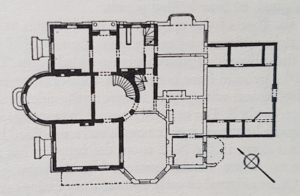 1959 Royal Commission on Historical Monuments Survey of Cambridge: the original early 19th cent. building forms about two-third of the present house block; 1813 is cut in the cellar brick work; 1814 us on the rainwater-heads. The SE third was added in the mid 19th cent…… both the NE and NW fronts to the original building are symmetrical; in the middle of the second is a large  semicircular bay the full height of the house flanked by reset rainwater-heads with the initial W.C., probably for William Custance and 1814.
