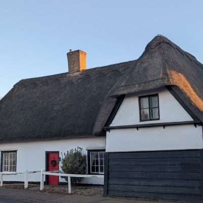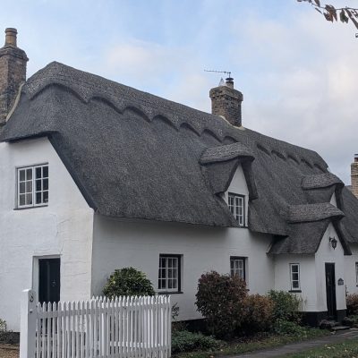 House, now 2 houses. 1911, converted 1978. Designed by M H Baillie-Scott for Dr John Forbes Cameron, later Master of Gonville and Caius College. Red brick with plain tile roofs and plain tall stacks. 2 storey and attics.
