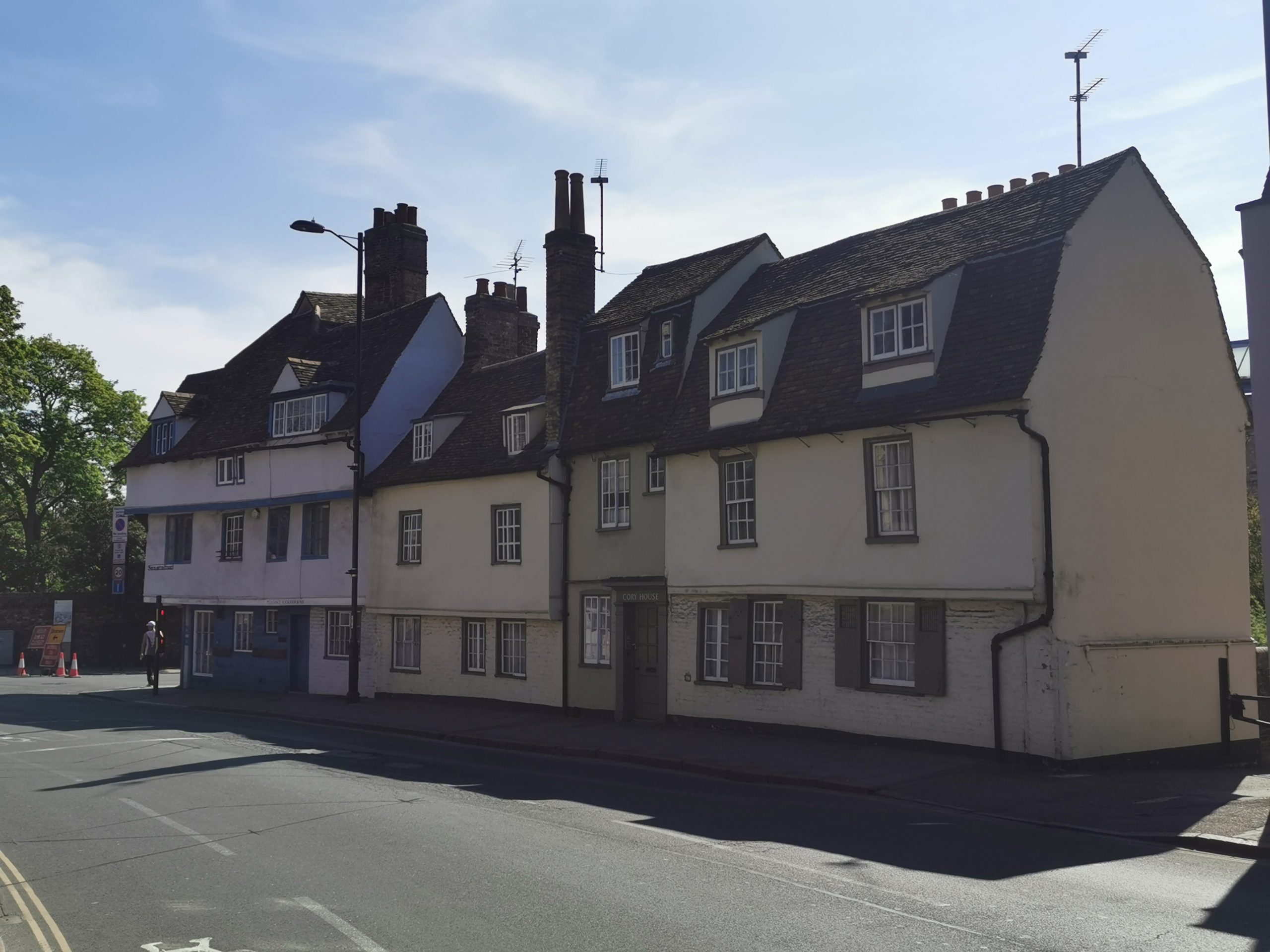 Northampton and Magdalene Street junction, Cambridge1959 Royal Commission on Historical Monuments Survey of Cambridge: a long narrow range bordering the street…has walls of brick and plastered timber framing…two distinct 16th cent. structures are linked by a narrow early 18th cent. building. The last represents the infilling of a through carriage-way.