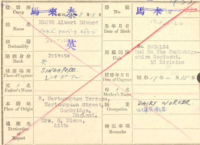 Albert Edward Blows: Private 5830164 1st Battalion, The Cambridgeshire Regiment, Suffolk Regiment who died on Tuesday, 10th August 1943. Age 25. Son of Harry and Ellen Blows, of Cambridge. Buried in KANCHANABURI WAR CEMETERY, Thailand. Grave 2. N. 35. (Source: UK Roll of Honour)