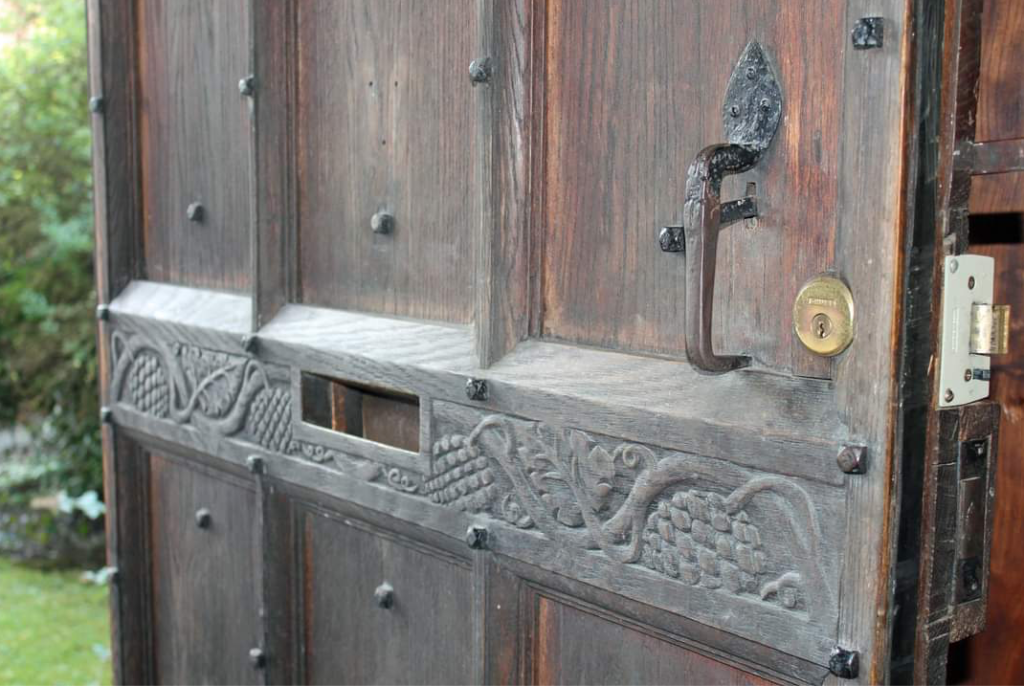 Front door design by Mackey Hugh Baillie Scott in 1912/13 for Herbert Ainslie Roberts of Gonville and Caius College and secretary of the University Appointments Board.