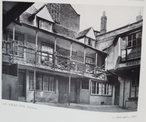 A lease to Andrew Pylkynton, innkeeper and his wife, in the archives of Corpus, dated 1566, mentions ” …. their two tenements, a greater and a lesser nowe made an Inne called the Eagle and Child sett and built together in the parishe of St Benett in Cambridge.” During the next century it was completely rebuilt.