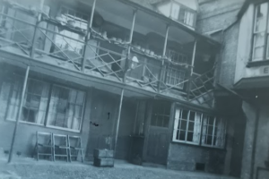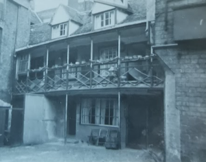 According to 1959 Royal Commission on Historical Monuments Survey of Cambridge not. 9, 8, 6, 7 and 8 have all at one time been incorporated in the Inn, originally the ‘Eagle and Child’ and described as the Post House in Loggan’s plan of Cambridge in 1688. A lease of 1826 of the property is held by Corpus Christi College; in it no.9 is ‘newly erected’, ‘lately rebuilt by the Master and Fellows.’ The carriageway in the middle is in much the position of that shown in John Hamond’s view of Cambridge of 1592. The courtyard gallery front, though now of c.1800, seems to represent an original feature.