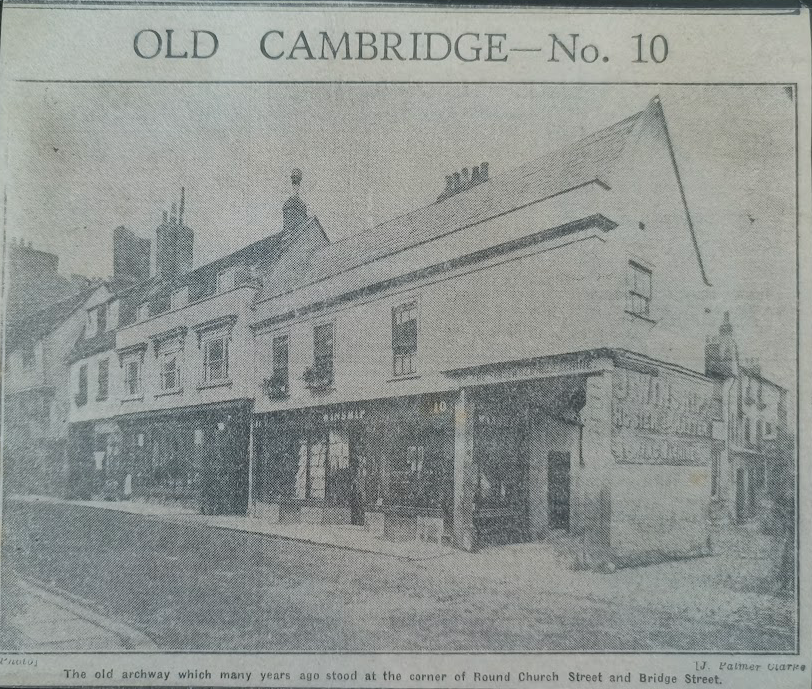 10 Bridge Street, Cambridge1959 Royal Commission on Historical Monuments Survey of Cambridge: Nos. 10 and 11, and No. 16 Round Church Street, and stand on the corner NW of the church of the Holy Sepulchre. No. 11 is of one build with No. 12 but now united internally with No.1o, which itself is one build with No. 16 Round Church Street. The last two were built in the 17th cent.; the walls are of plastered timber-framing. … On the first floor of No.10 mucho pf the main room is lined with 17th cent. panelling … loose in the attic is a 16th cent. bargeboard carved with leaf and vine ornaments.