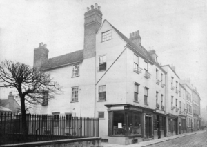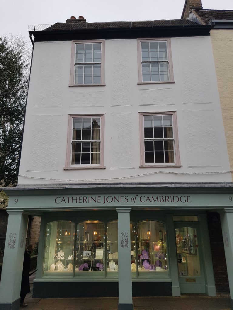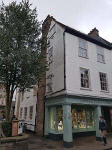 1959 Royal Commission on Historical Monuments Survey of Cambridge: of three storeys with cellars and attics, has plastered timber-framed walls, with some clutch in the cellars, and tiled roofs. It is L-shaped on plan. The street range has 16th cent. cellars, but above ground it is an 18th cent. rebuilding. … the cellar under the NE range contains a 16th cent. door with linenfold panels … the house contains many reset lengths of 17th and 18th cent. panelling and several panelled doors of the same periods.