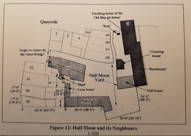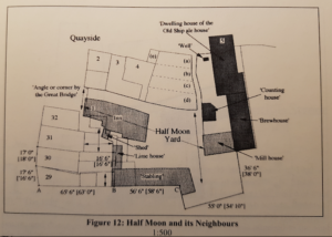The earliest (c. 14th cent.) buildings known on this site were two cottages on strips (c) and (d) which belonged to one of St Clement’s chantries. There were two more cottages near the Bridge Street entrance to what became the Half Moon Inn.