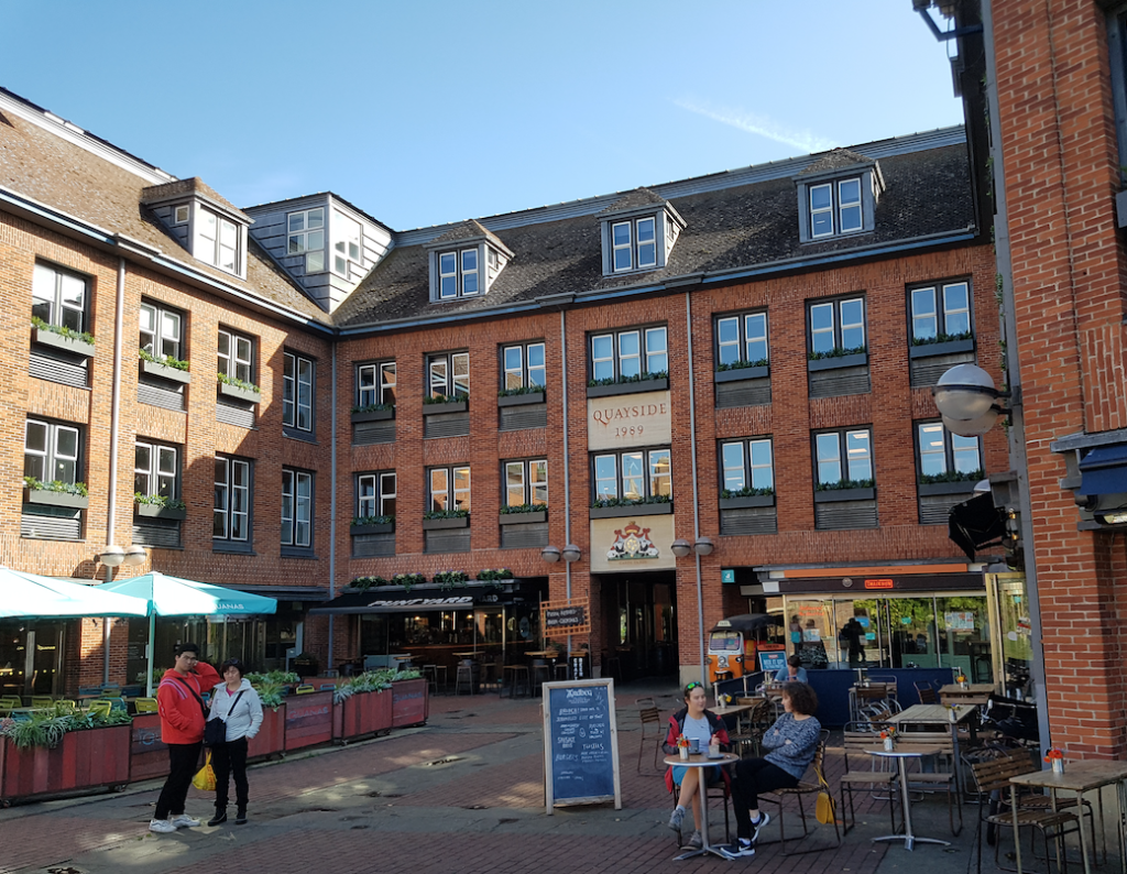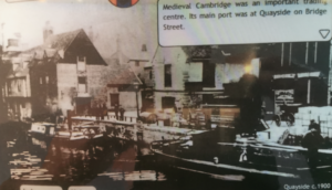 The Quayside in 2019Peter Bryan ( “Cambridge – The Shaping of the City” 2008) notes that there is evidence of Danish traders from c. 900AD living in the Quayside area, which was known as the Hulme, a Danish word indicating an island in a marshy area. It seems likely that they were Danish traders who had come from Ireland. The Liber Eliensis refers to Cambridge in the 10th century as a port of the same rank of importance as Norwich, Ipswich and Thetford.