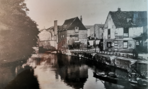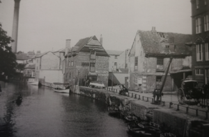 1939 J H Bullock, Bridge Street, 1939 – Cambridge Public Library: there were quays and warehouses on both banks of the river and on both sides of the bridge. To these quays came everything needed for the life of the district by barge. By far the greater part of the goods were landed at Quay Side. When I was a boy I used to hear when the ‘bridge-porters’ used to prop up the bridge while waiting for a job.
