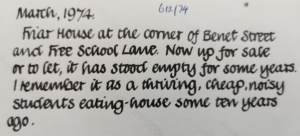 Photo kindly sent by family which shows family details including ownership of the Friar House restaurant by the Curry family in the 1940s and 1950s. See 12 Bene’t Street entry.