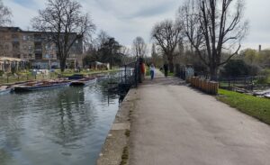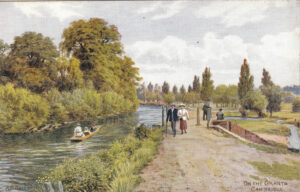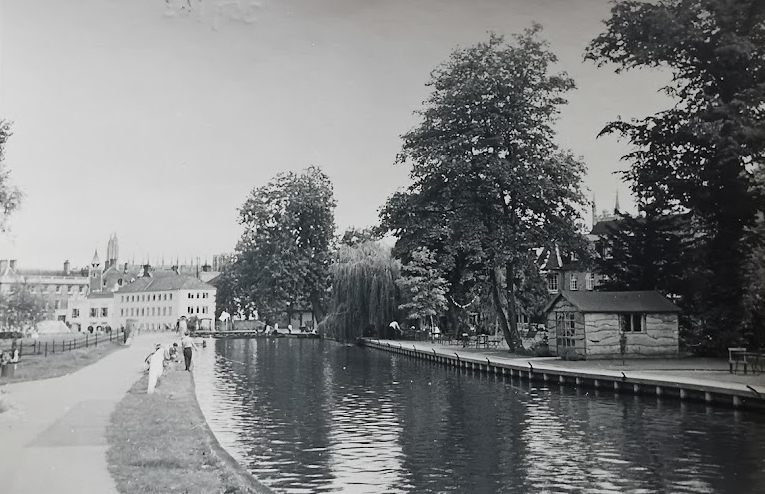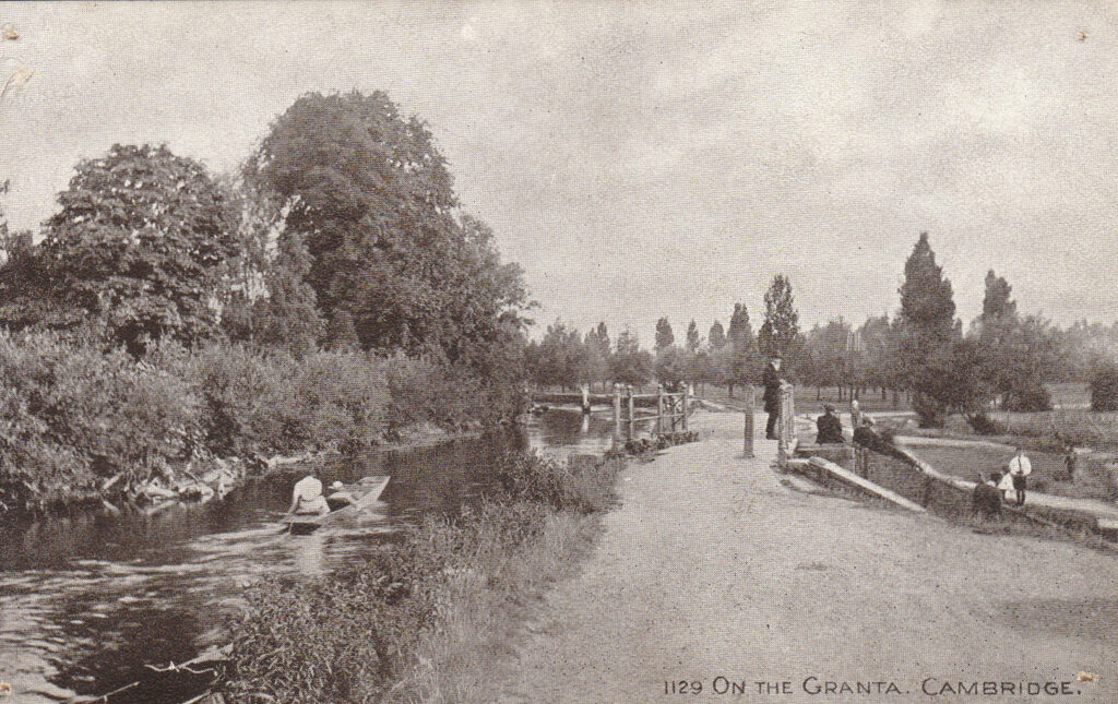 Footpath next to Laundress Green (undated)M E Keynes wrote in A House By the River in 1976: Laundress Green is the small triangular piece of common-land seen from Silver Street bridge to the right of the Mill pool. The name presumably originated in the Green’s use as a drying-ground for a number of University laundries and for washer-women living in the two parishes of St Botolph and St Mary the Less. On Mondays and Tuesdays the ground was free from grazing animals, so that women from Granta Place and Mill Lane could safely hang out their laundry there to dry. For this privilege they probably had to pay a shilling a year to the Corporation and put up their own posts, as they did for a similar use of Coe Fen near by. In Victorian and Edwardian days, the Green used to be gay with washing fluttering and dancing in the breeze but the custom has long since died out. During spring-cleaning, however, until more recent times, carpets and mats were still brought there for beating; probably the use of vacuum cleaners put an end to this custom too.