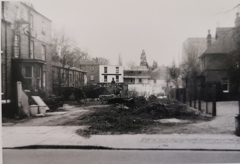 All Saints vicarage (r) and backs of Manor Street houses (l) seen from Jesus Lane. The newly created gap will become the new Manor Street.