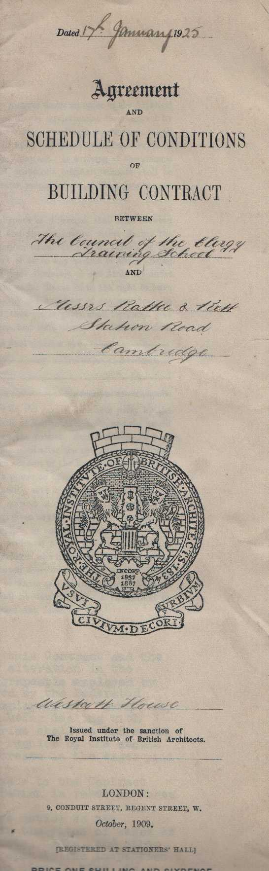 In 1925 the Training College, now designated Westcott House, entered into contract with Rattee and Kett for the erection of ‘cloisters library keeping rooms and chapel and forming terraces etc in the central court’ at a cost of £15,736.
