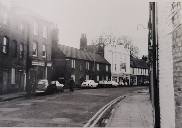 Looking towards the Horse and Groom Public House from the ‘Four :amps’ end of the street. Pikes Walk leads off to the left. The alms houses were used at the time as a night shelter for the homeless.