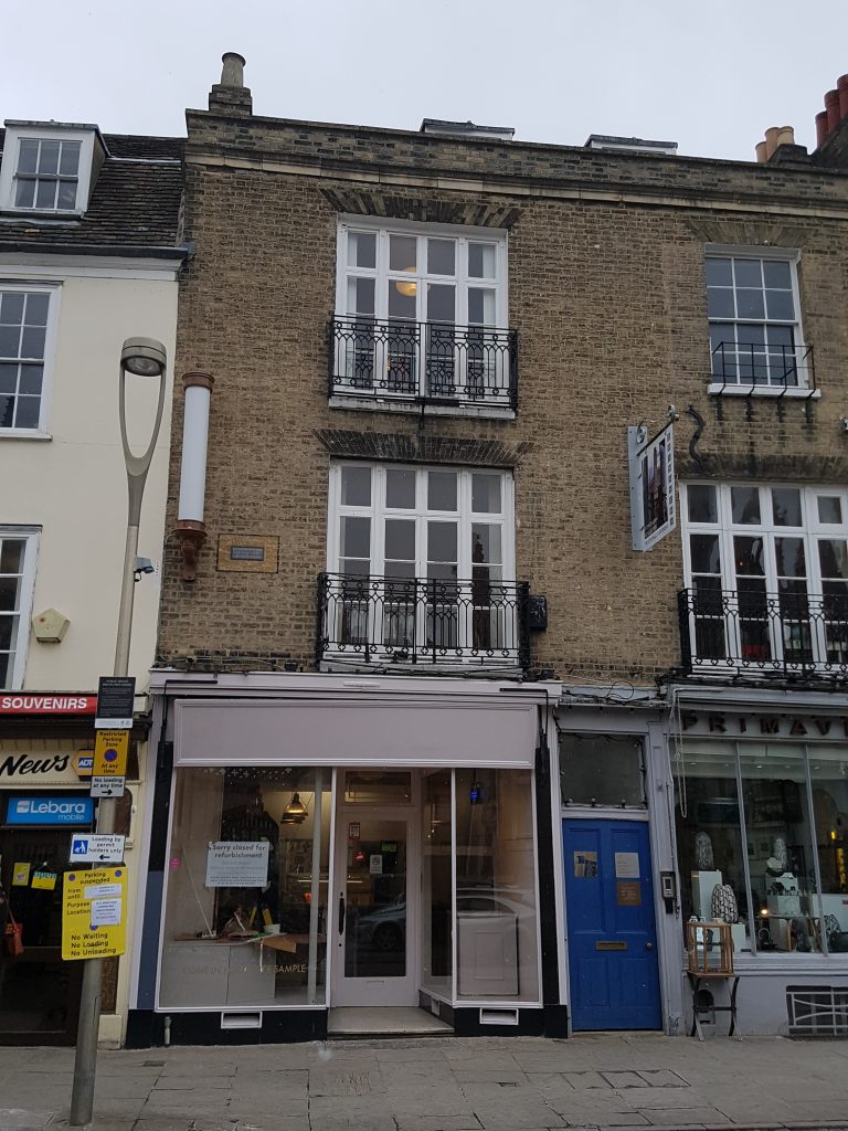 Arthur Gray in Cambridge Revisited notes that over the entrance is a red tablet recording that : “Charles Lamb lodged here in August, 1819.” Here Lamb and his sister Mary met the little orphan daughter of Charles Isola, one of the Esquire Bedells of the University. They were afterwards to adopt her.