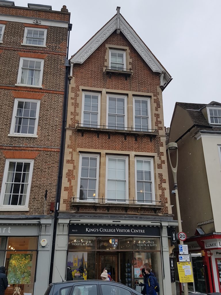 C19. 4 storeys, 3 windows. Red brick, long and short stone quoins. Gable with ornamental bargeboards. Sash windows. Modern shop front on ground floor. All the listed buildings on the East Side of King’s Parade form a group.