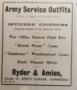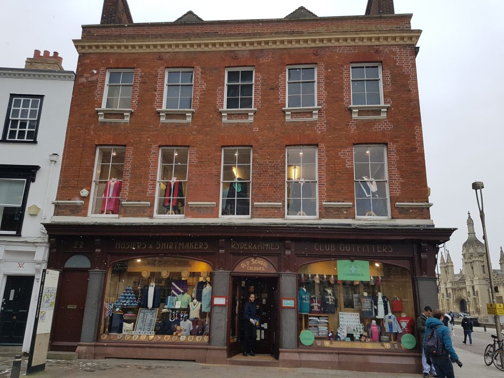 Ryder and Amies used to occupy 21 King’s Parade as well. The business was started in 1904. They used to have a workroom on Peas Hill for their tailoring. There used to be a Conservative Club on the first floor.