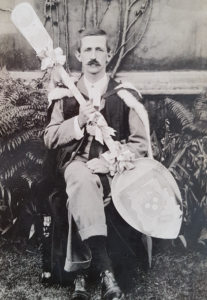 Surrounding the ‘failed’ student, and wooden spoon ‘winner’ (thanks to a detailed key of all individuals featured in the painting) are the most important academics including Charles Kingsley, Henry Sedgwick, Henry Fawcett and Leslie Stephen, accompanied by their families, as well as two bowler-hatted figures standing on the corner of Great St Mary’s Church, behind the white and black dog, next to the women in a grey dress on the left of the painting. These are two of the four England cricketers from the town, Thomas Hayward and Robert Carpenter, at a time when the Cambridge Town and County Cricket Club was one of the best sides in the country. Their inclusion in the painting indicates their social importance, thanks to the increasing status of cricket, and perhaps sport more generally in the University.