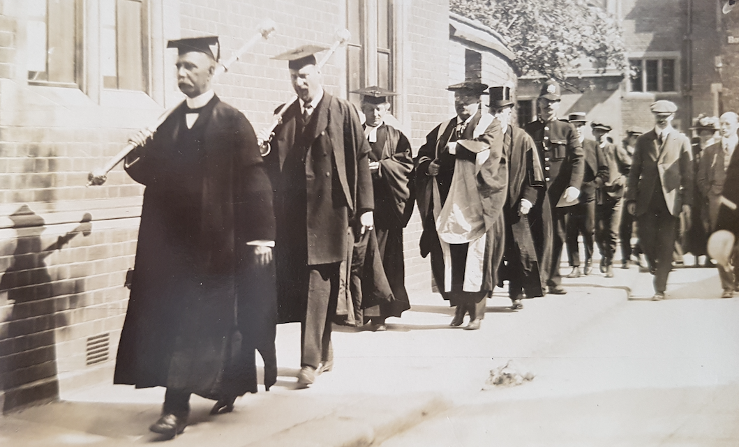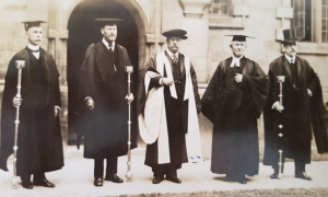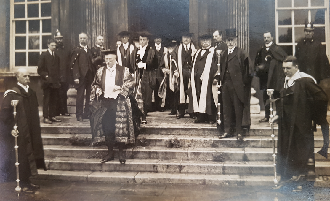 The photo above shows from left to right: an Esquire Bedell, Theodore Roosevelt, Vice Chancellor Canon Mason, University Marshall Sheldrich
