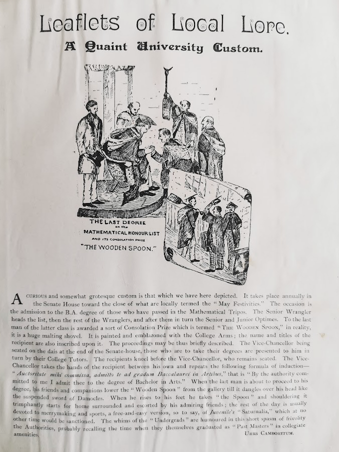 ‘Degree Day’ was painted by Robert Farren in 1863 portraying a lonely student accompanied by a small dog, in the foreground, who has failed his final exams, presumably having just seen his results posted outside the Senate House, the building  just behind him, on the right of the painting. To the left of this student, close by, is the ‘wooden spoon winner’. Note the relatively small size of the spoon, compared to what it grew into. [Brief history: starting in at least 1795, the wooden spoon was awarded to the student who came last in the final exams for the maths honours degree, called the Maths Tripos].