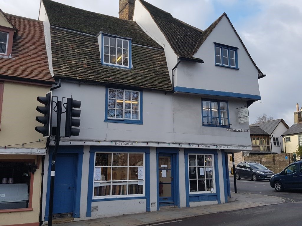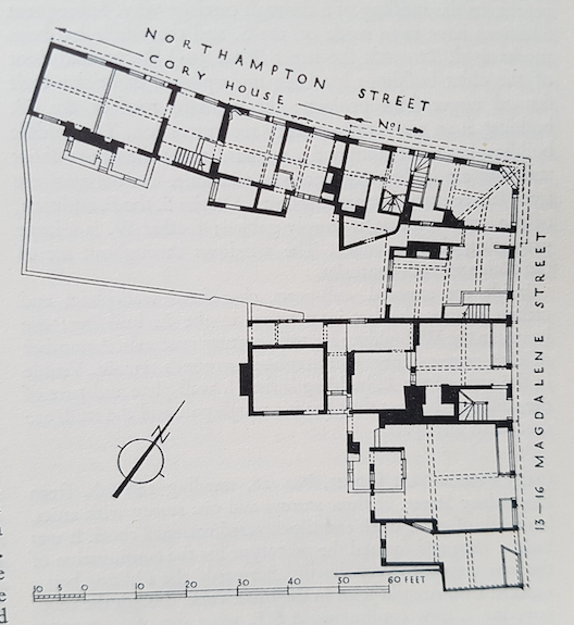 1959 Royal Commission on Historical Monuments Survey of Cambridge: Nos. 13, 14 and No.1 Northampton Street forming the corner block, of two storeys with cellars and attics, has timber-framed walls and tiled roofs. It consists of two 16th cent. ranges nearly at right angles to one another, all of one build, though now divided, and later than the adjoining range. In the 17th cent. the attics were reconstructed.