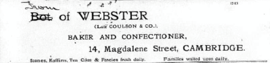 Frank Alphonso Webster was born on 6 September 1888 to parents Robert Henry and Silvester (née Farey); Robert was a painter and house decorator. In the 1891 Census he is living with his parents at 8 Downing Street, Cambridge. By the 1901 Census, aged 12, he and his family have moved to 1 Victoria Street, Cambridge. Ten years later he is recorded as being a pastry cook, but still living with his family at 1 Victoria House, 1 Victoria Street, Cambridge. In 1913, Frank’s name is listed under W N Coulson & Co, bakers and confectioners, at 14 Magdalene Street, Cambridge. William Neal Coulson appears in the 1901 Census at this address but by the 1911 Census had moved to Victoria Road and retired as a baker and confectioner; there is no entry in this latter Census for 14 Magdalene Street.