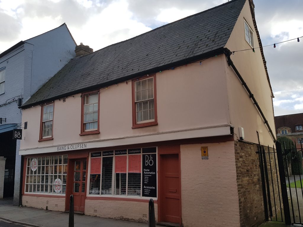1959 Royal Commission on Historical Monuments Survey of Cambridge: of two storeys with attics, has walls of plastered timber-framing and of Brock… built in the 16th cent. and remodelled lat in the 18th…heavy oak purlins remain in the S roof-space ad many original rafters survive.