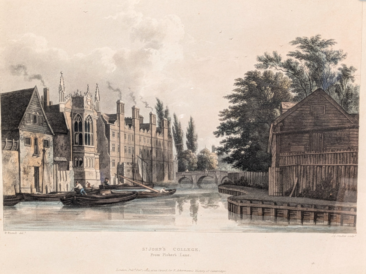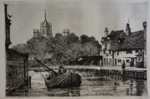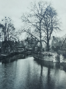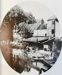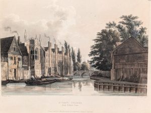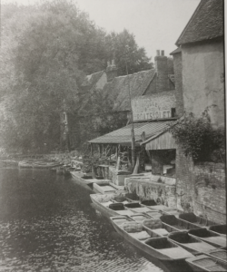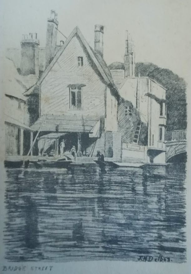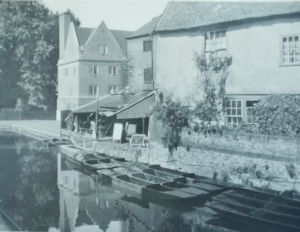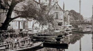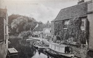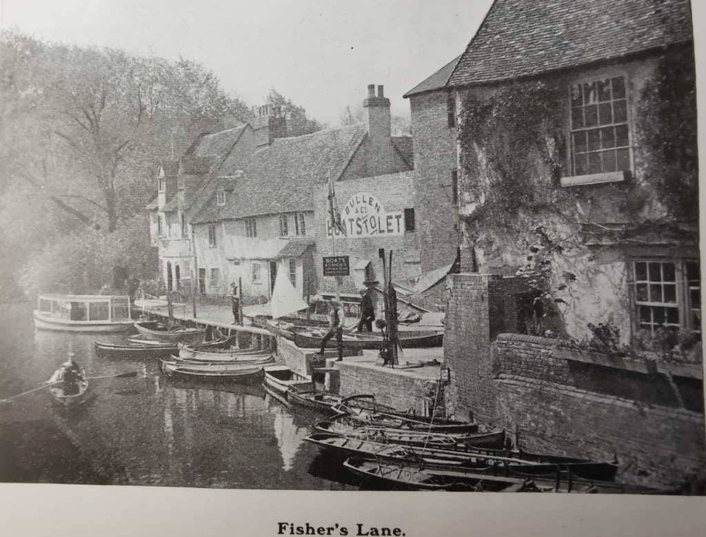 W F Turner, Old Cambridge – Cambridge Chronicle 19.11.1929: The wharf down Fisher’s Lane was at one time a very busy place when barges came filled with merchandise and in the cottages lived the bargees. At the Pickerel Inn there still existed a room called the Cock Pit where the men who plied the ferry which existed before the first bridge was built used ton spend their spare time in cock fighting. He was given to understand that at one time the Binn Brook was a waterway up which coal and merchandise was taken to Barton and Coton. One of the old inhabitants well remembered the state of affairs when there were very elementary sanitary arrangements, and the river was the source of water supply. When he was a boy, the old man said, there lived an old woman who used to get her water every evening in a bucket attached to a pole with a metal clip at the end. One evening when she was filling her bucket he noticed a dead dog in the water near the bucket and called to her, ‘Oh! look there’s a dead dog’ to which she calmly replied, ‘I always boils my water before I drinks it.’