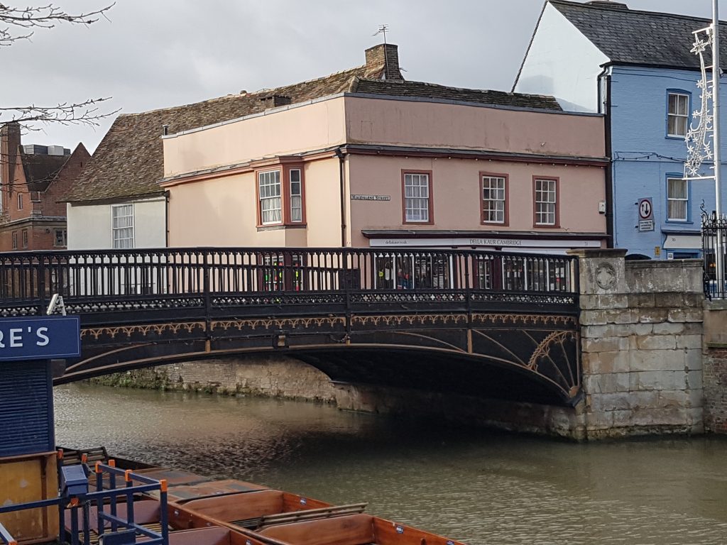 In 1822 there was a replacement bridge of revolutionary design including ornamental railings cast by the Finch foundry in Cambridge. Their strength was tested in 1929 when a motor car crashed through them and hung over the river. By then the bridge was carrying far more traffic than ever intended. In 1953 a weight restriction was imposed but by 1967 there was a 2in dip in the centre. Buses and lorries were banned and the Government announced plans to replace it by 1971. However opposition prompted a change of heat and the bridge was remodelled retaining its original appearance. (Vanishing Cambridge, Mike Petty)