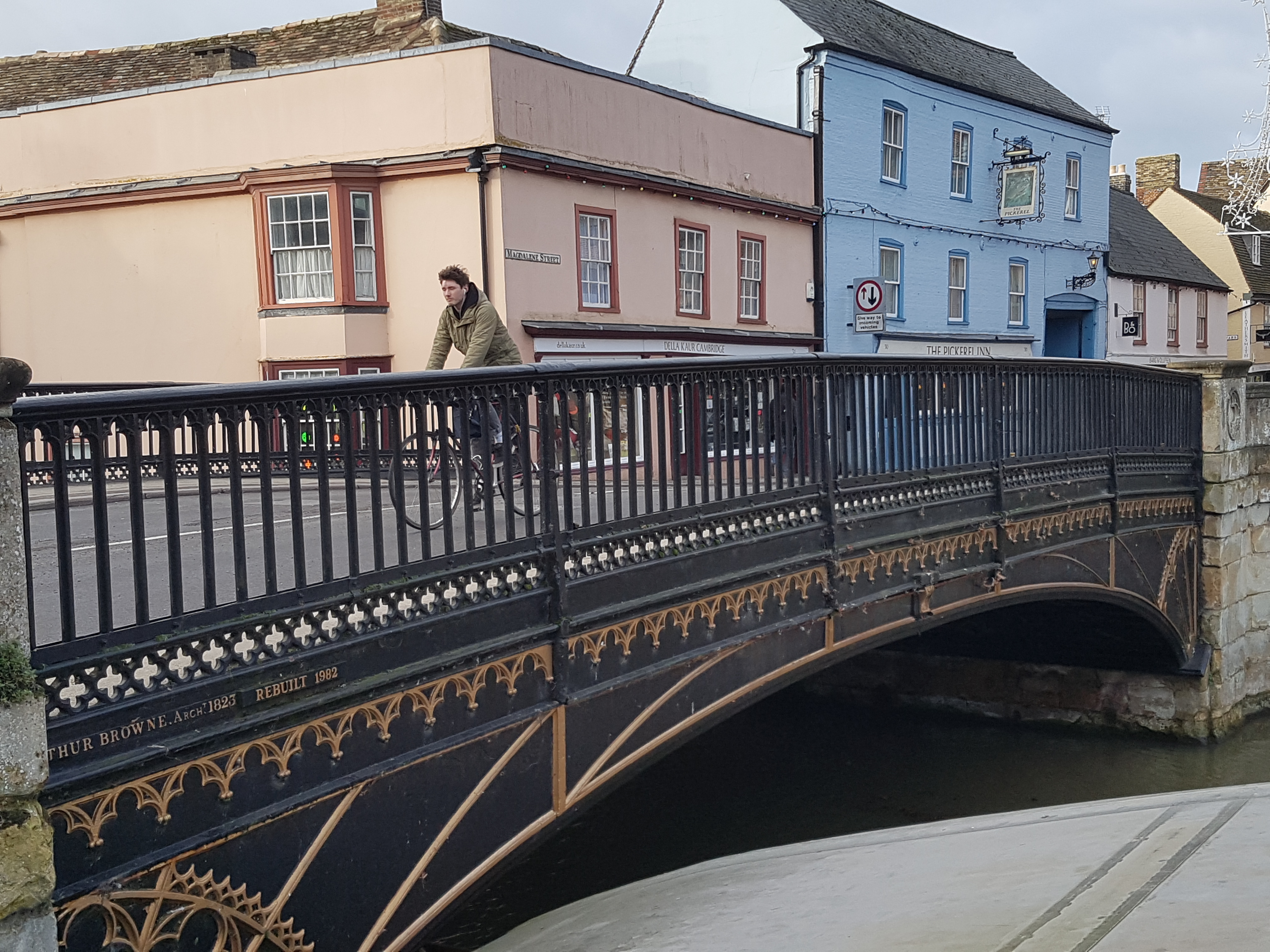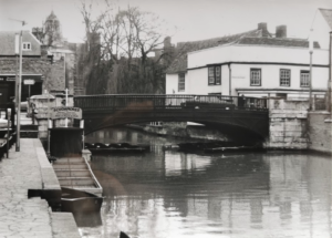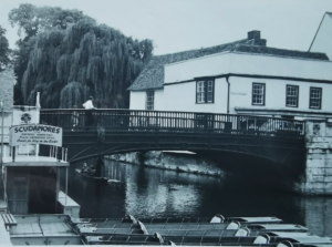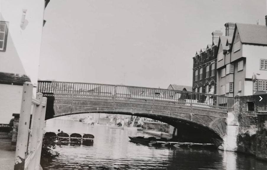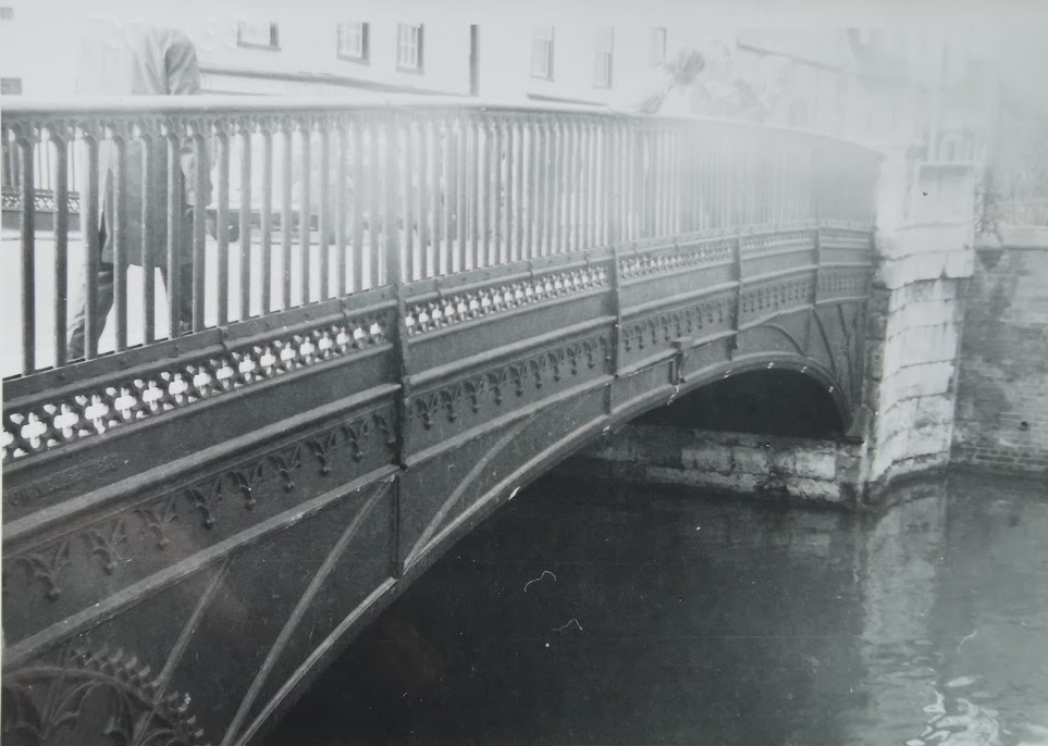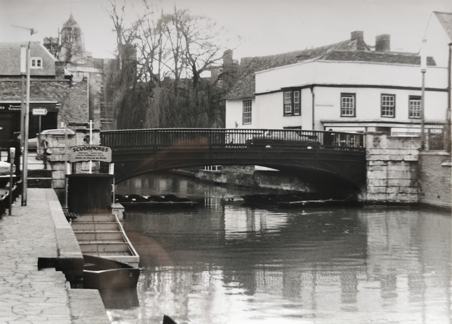 In 1822 there was a replacement bridge of revolutionary design including ornamental railings cast by the Finch foundry in Cambridge. Their strength was tested in 1929 when a motor car crashed through them and hung over the river. By then the bridge was carrying far more traffic than ever intended. In 1953 a weight restriction was imposed but by 1967 there was a 2in dip in the centre. Buses and lorries were banned and the Government announced plans to replace it by 1971. However opposition prompted a change of heat and the bridge was remodelled retaining its original appearance. (Vanishing Cambridge, Mike Petty)
