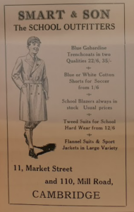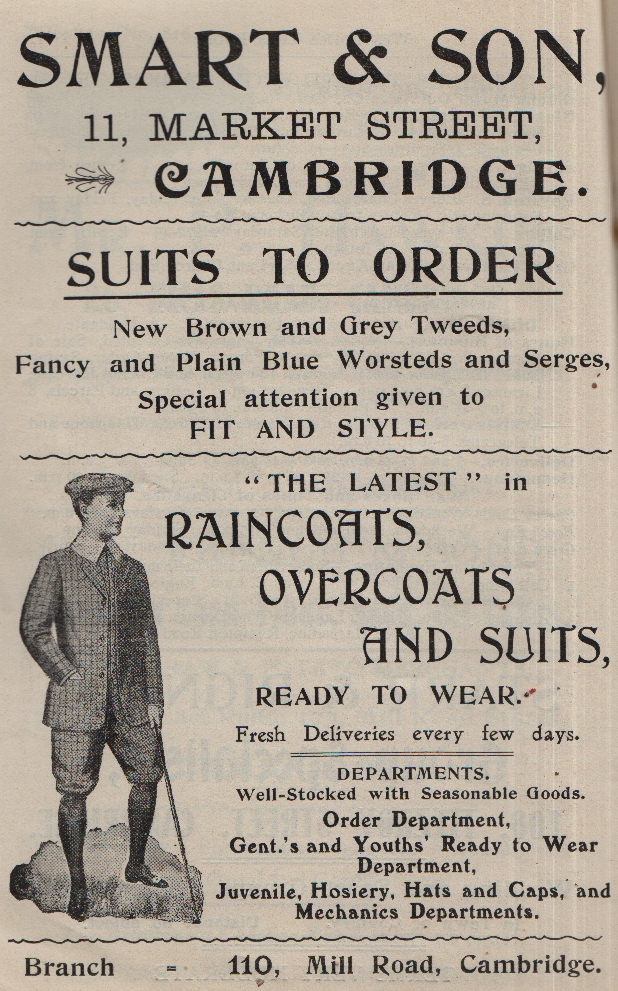 27/11/1933 Joel Smart was the son of a Gloucestershire cloth manufacturer. Coming to Cambridge shortly after the battle of Waterloo he commenced business at 59 Bridge Street in 1826, removing in 1840 to 1 Petty Cury and in 1853 to 11 Market Street. Here he purchased the clothing business of Watson Taylor who had been trading from early in the century. He took his son, Charles, into partnership, in whose family the business still remains. Such is the history of one of the oldest firms in Cambridge where customers will find all the latest materials and the most fashionable styles at keen prices. (Cam. News)