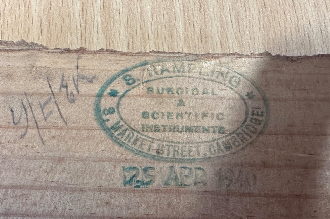 HA sent this note in 2024: I was recently given a skeleton by an alumna’s executor which was found amongst her belongings after she died. The box it was in contains a stamp (photo attached) which says ‘S. Rampling, 3 Market St Cambridge, Surgical & Scientific Instruments’ and a date stamp 25/04/1940.