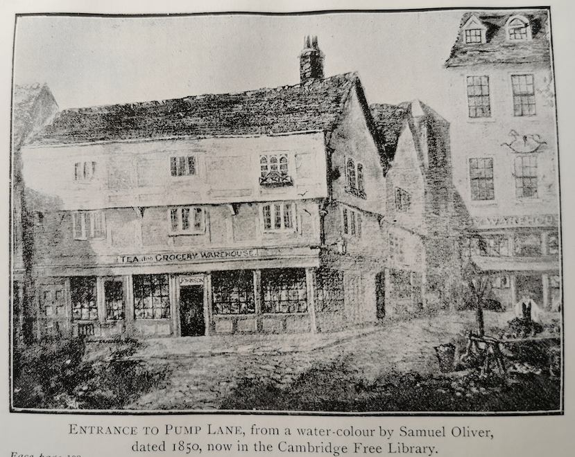 The south entrance to Pump Lane, Johnson's grocers on the left. Painting by S Oliver 1850.Before the fire of 1849 this was the road to the east of St Mary the Great. There were properties on both sides. On this map west is at the top. The properties shaded were destroyed in the fire.