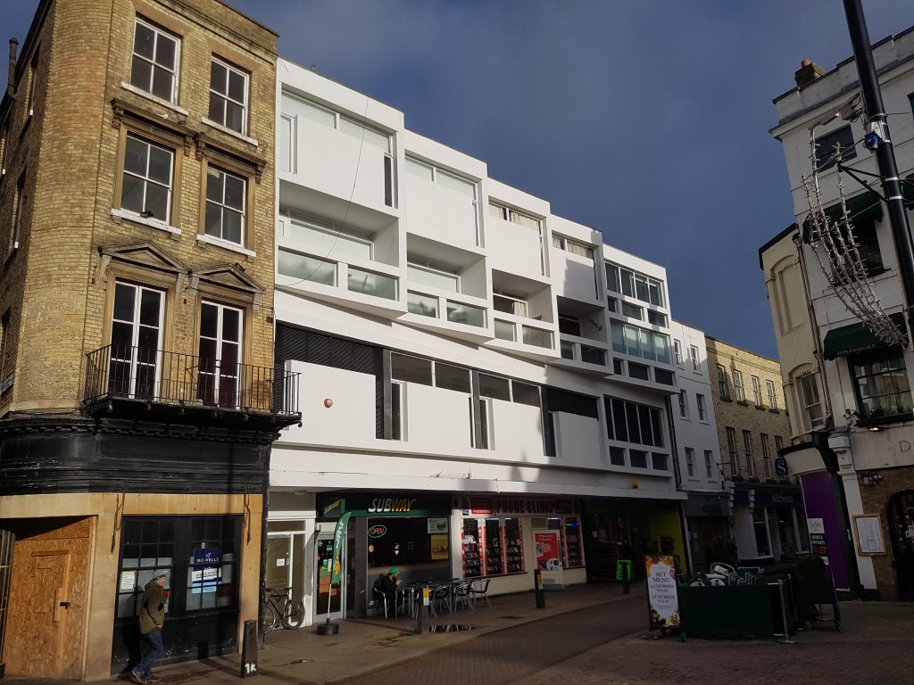 Radcliffe Court, 1964, was built by Stanley R Nevell & Partners with a frontage designed by the City Architect’s department. Mixed use, ‘the maisonettes above the first floor set askew like sawteeth.’ (Pevsner)