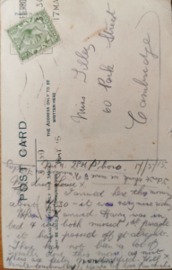 1915 post card to Miss Tilley, 17th May 1915. The card is from Archie, presumably Archibald Cyril Diver whom Louisa E Tilley married in Cambridge in April 1920. In 1911 Archie was an electrical engineer boarding in Bedford.