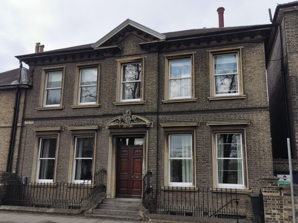 22 ParksideMid C19. Grey gault brick, partly rendered. 2 storeys, five windows, sashes 2:1:2, the centre one set forward with six-panelled door with rectangular light over on ground floor. Doorway with moulded stone architrave and pediment. All windows with moulded stone architraves. Broken eaves pediment. Wooden cupola at rear. Hipped slate roof. Cast-iron spear head railings.