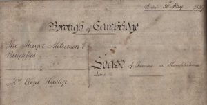 The indenture dated 30th May 1839 between the Borough of Cambridge and Eliza Haslop, widow of Peter Haslop, butcher, concerns the property which had been let originally to John Willimott in 1821 but control of which had passed to Eliza Haslop. At some point the property has been converted into a slaughterhouse with yard, stable and outhouses.