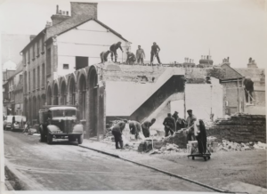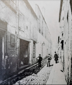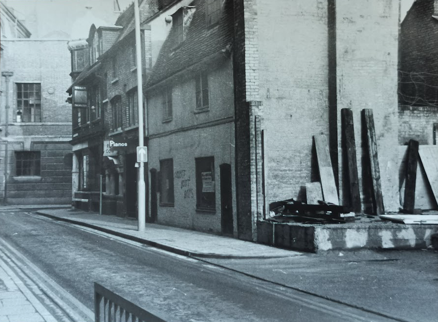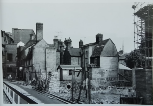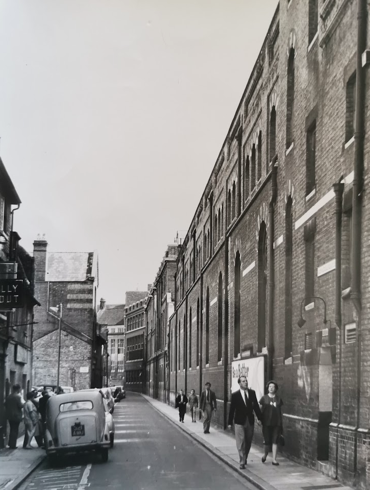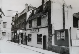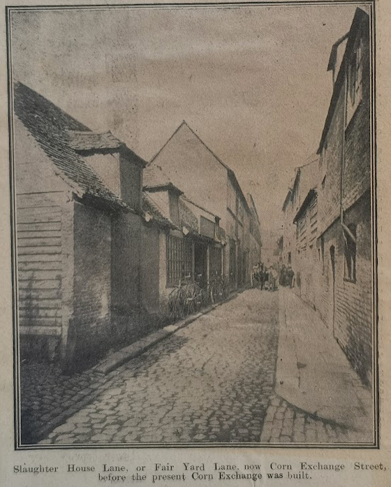 Corn Exchange Street 1865. Bicycle hire shop (Cambridgeshire Collection)Corn Exchange Street was previously known as Slaughterhouse Lane and before that, Fair Yard. To the east of the lane was the Beast Market and a slaughter yard. The map published by he Historic Towns Trust of Cambridge in 1800 shows Slaughterhouse Lane and Union Street on the west side of the modern Guildhall site.