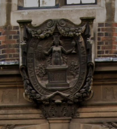She carries a radiant sun in one hand, a wine-cup in the other and battlements on her head Look closely and you can see raindrops falling into the cup. Around the whole emblem are the Latin words which mean literally ‘Hence light and sacred draughts.’