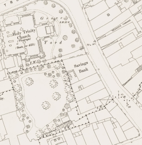 Properties on Sidney Sussex Street, west side, south of Holy Trinity Church as far as Petty Cury, seem quite hard to locate in the censuses accurately. In 1886 a bank is shown where no.65 would have expected to be. In 1842 a bakery was put up for sale at what appears to be this location, next to Trinity Church. This was part of the Nutter sale of 1842.