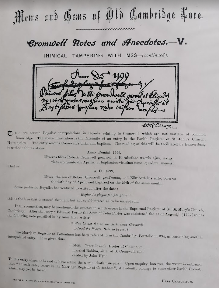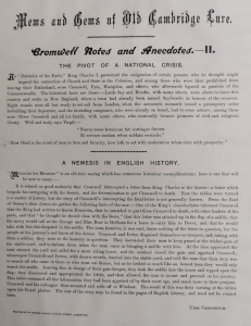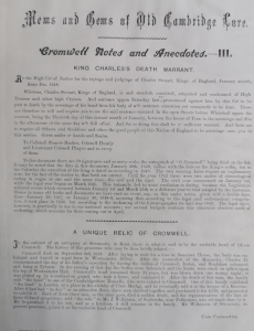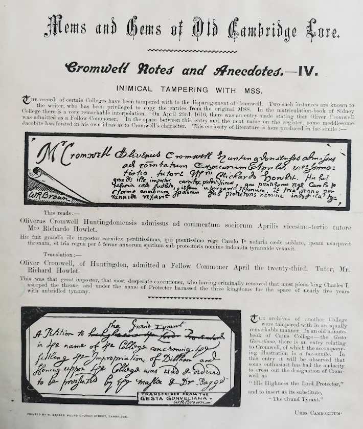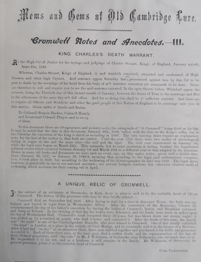 The Cambridge Ghost Book, Halliday and Murdie, 2000, has a chapter about Cromwell’s head. In 1960 the college chaplain held a ceremony to mark the interment of the head; a very few people at the college at privy as to the whereabouts.