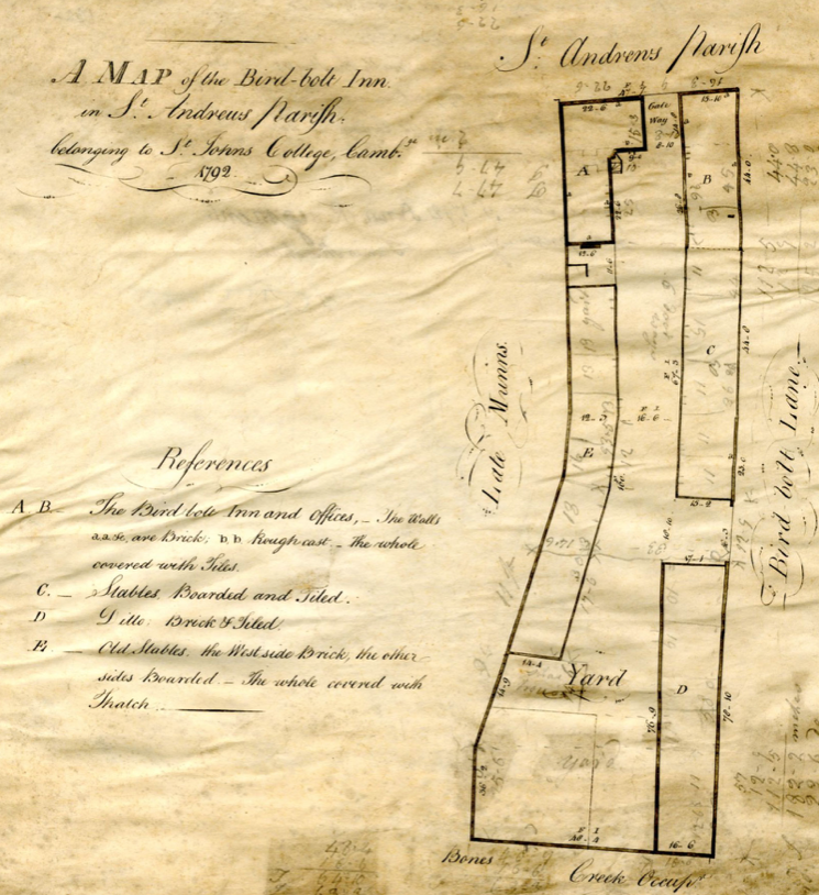 The Grand Arcade archaeological excavation (see 2019 report p.253) produced a number of C18th archaeological finds at this site. Their report also illustrates the English tin-glazed earthernware sherds from plates marked Pink at the Birdbolt produced for the landlord Jonathan Pink found in 1905.