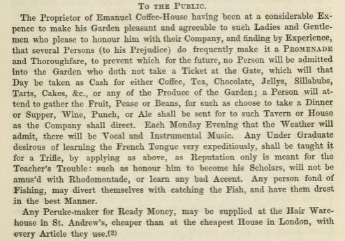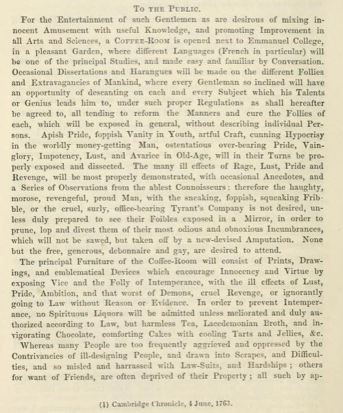 Two of the public adverts on the Emmanuel Coffee House quoted by Charles Henry Cooper in his Annals of Cambridge vol. 4 pp. 328-329: