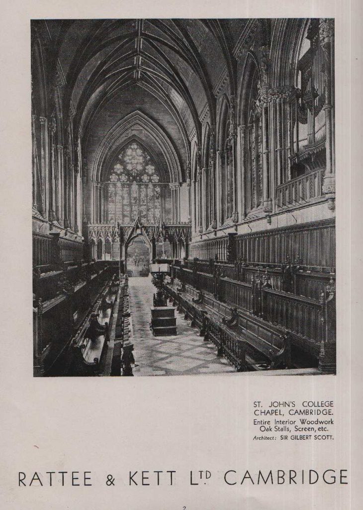 Rattee and Kett constructed (1866-1869) the entire interior of the chapel – woodwork, oak stalls, screen etc. The architect was Sir Gilbert Scott.  A more detailed description can be found here: